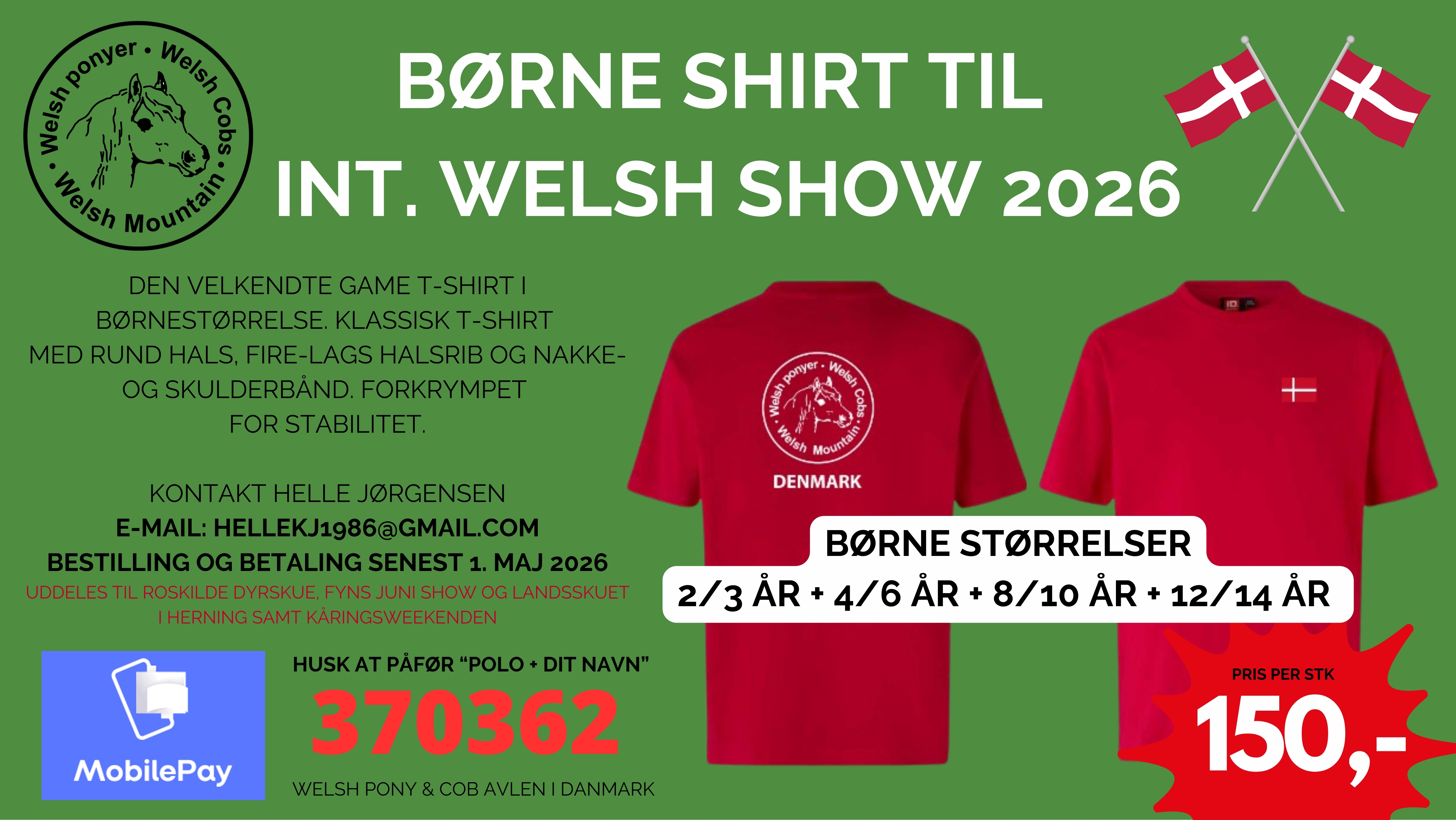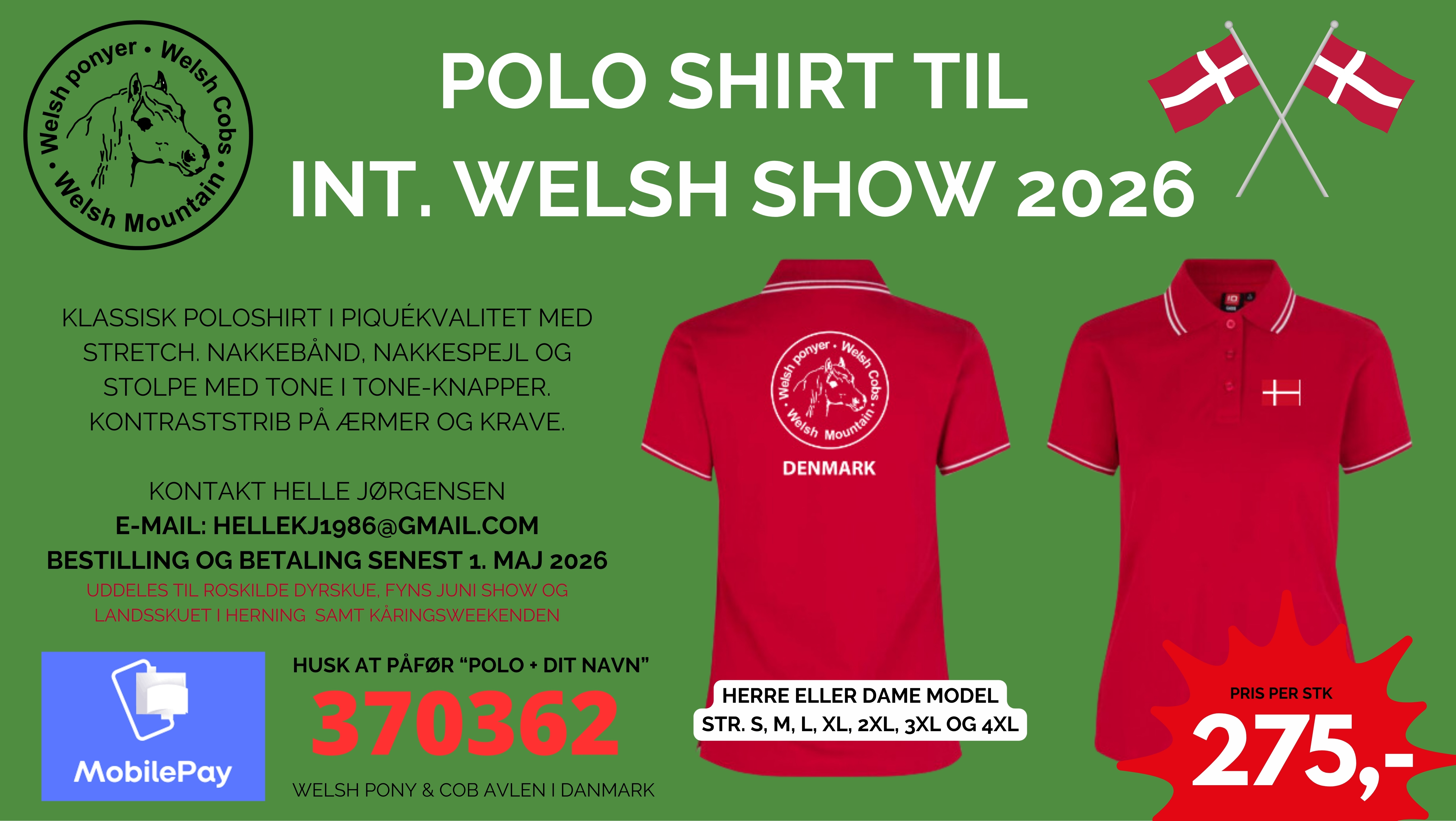 4. marts Til august er der atter Internationalt Welsh Show i Holland, og i den forbindelse er det muligtat bestille røde polo-shirts til damer og herrer, samt alm. røde t-shirts til børn. De kan også bruges til dyrskuer eller lign. Det er helt op til dig. Det Int. Welsh Show finder sted 21.-22. august 2026 i Holland. Læs mere: www.internationalshow2026.com Frist for bestilling er 1. maj 2026 Bestil via linket: https://forms.gle/Aybuim2jmgB8PLdp6 Har du spørgsmål til din bestilling --> Kontakt bestyrelsesmedlem Helle Jørgensen - eller tlf. 27372367 ___________________________________________________________________________________ 27. februar 2026: Welsh Inside med invitation til generalforsamling udsendt på mail.Tjek SPAM filter. 25. februar 2026: Der er i dag udsendt mail til alle medlemmer, tjek evt. SPAM filter. 20. februar 2026: Opdatering kalender og eventoversigt med danske meddommere. 26. januar 2026: Reminder udsendt pr. mail angående kontingentbetaling 2026 23. januar 2026: Hjemmesiden opdateres ikke mellem 23.01. - 26.01. 2026 grundet Webmaster er på kursus. OBS Henvendelser om medlemsskab og kontingent besvares fortsat. 15. januar 2026: Medlemsportalen er opdateret i Dokumentarkivet under Referater fra Avlsudvalget. 11.januar 2026: Opdatering Salgssiden sec. A , nye salgsponyer og dommere på eventoversigten. Om kontingentbetaling på mobile pay, find opkrævningen under kommende aktiviteter 6. januar 2026: Kontakt til bestyrelse og udvalg; mailadresse og telefonnummer findes under ____________________________________________________________________________________________ Der er nu udsendt mail til alle medlemmer med adgangskode til den nye medlemsportal. Det hele er under opdatering, så der kommer meget mere undervejs. Tjek spamfilter, hvis du ikke har modtaget mailen. Der er ligeledes orientering om kontingentbetalingen. 3. januar 2026 OPDATERING Hjemmesiden er opdateret med Welsh dommere til Landsskuet og Det Fynske Dyrskue OBS kalender bliver løbende opdateret med arrangementer og dommere mv. 12. december webmaster _____________________________________________________________ Welshforeningens gamle hjemmeside Welshforeningens gamle hjemmeside er lukket ned, men kan nu tilgås som ARKIV. Det vil sige, at den gamle hjemmeside bliver ikke opdateret, men alle de gamle materialer er bevaret her. www.welshponyerarkiv.dk OBS GÆLDENDE BLANKETTER: ALLE BLANKETTER MV. SKAL DOWNLOADES FRA DEN NYE HJEMMESIDE! 4. december 2025 / webmaster __________________ Velkommen til Welshforeningens nye website. Endelig er det lykkedes med at nå et resultat med foreningens nye website. Vi er derfor glade for at kunne byde velkommen til det nye website i foreningens jubilæumsår 2025 og tæt på julen som en lille ekstra julegave. Arbejdet med hjemmesiden har været længe undervejs, og der har været mange forhindringer i processen. Vi håber, I vil tage godt i mod det nye website, som er under stadig opbygning og tilretning. Som noget nyt vil der blandt andet være mulighed for logo i avlerfortegnelsen, en ny opsætning af annoncer og hingstekatalog samt mere synlighed af rideklasser. Den gamle hjemmeside vil inden længe blive tilgængelig som en arkivside med adgang til de gamle materialer, når vores IT konsulent er færdig med at tilrette diverse links. Skriv endelig til webmaster, hvis I har spørgsmål mv. Ellers håber vi bare, at I vil nyde at gå på opdagelse på hjemmesiden. Bedste hilsener Webmaster Linda Weyhe-Jeppesen 2. december 2025 |