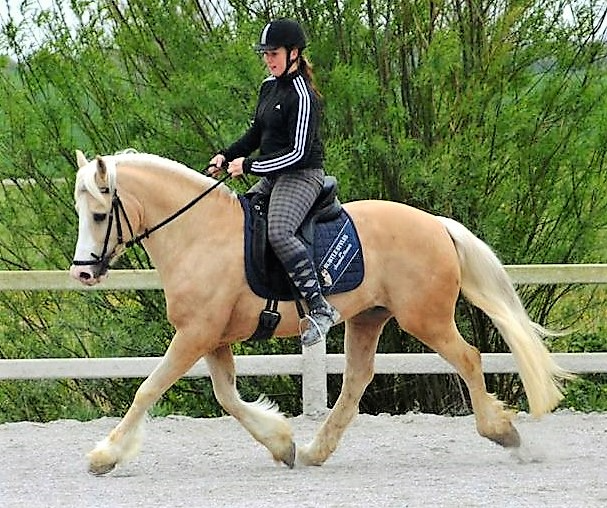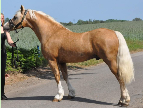 Fjordglimt Golden Scott WDH 70, kåret 2. kl.A Født: 03.06.2019, palomino, stangmål:145.5 cm m. sko Gjord:182 cm Pibe:19.5 cm Far: Trevallion Evoque 96273 (GBR) Mor: Rhydypandy Sunshine 152202 (GBR) Morfar: Janton Lightning 49125 (GBR) Kåringsbeskrivelse: God type med kønt hoved og god udstråling. Passende lang forpart med god skulder, velformet overlinje og muskuløs bagpart. Gode, føre lemmer med korte piber, muskuløse underlår og velformede hove. Korrekt, god skridt. Traven er korrekt, men mangler lidt kraftfuldhed. God, kraftfuld galop. KONTAKT: Nanette Bjerg, Skjern Tlf: 60 77 14 89 Mail: nanette@live.dk |