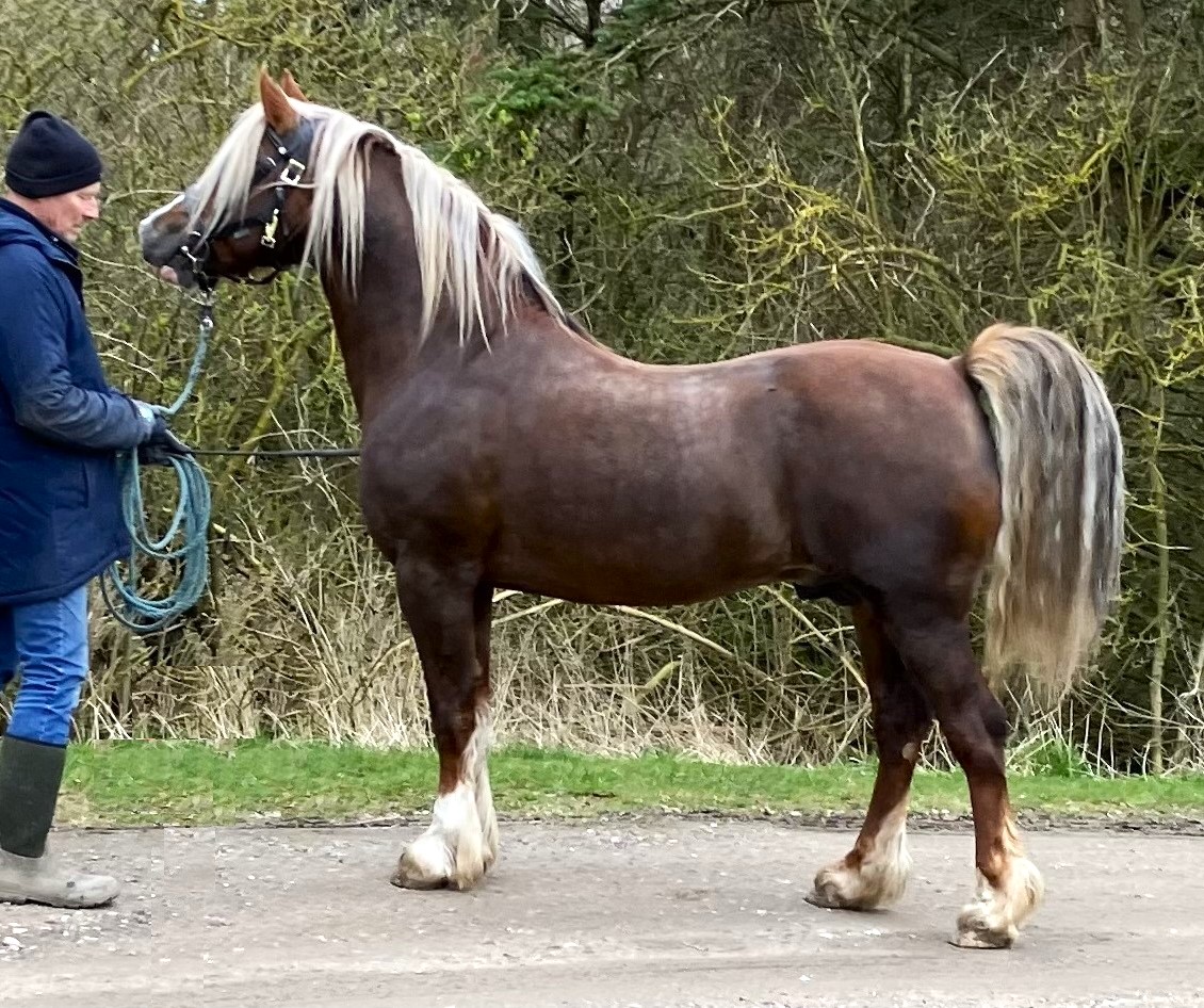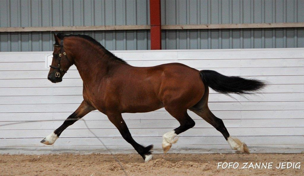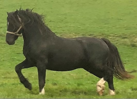 Menai Sam Jones WDH 68, kåret i 2. klasse Født: 13.05.2015, brun, stangmål: 148 cm Gjord: xxx Pibe: 20 cm Far: Pennal Sam 90600 WSB Mor: Menai Sparkling Empress 142092 WSB Morfar: Menai Sparkling Image 35386 WSB Kåringsbeskrivelse: God og kraftig type, dog med et smule langt hoved. God og kraftig front, god hals og skulder. Savner lidt dybde. God stærk overlinje med velansat hale. Passende føre lemmer med små hove. Indkneben under forknæene. Skridten er tilfredsstillende men snæver. Traven savner afskub for hånd. Løs vises traven kraftfuld med godt afskub, dog ønskes mere knæløft på forbenene. God og jordvindende galop. Type: 8 Kropsform:7 Fundament: 7 Bevægelse: 7-8-8 Helhed: 7 Gennemsnit: 7,4 KONTAKT: Bente Marie Larsen, Fuglebjerg Tlf: 27630343 Mail: bentemarielarsen@live.dk |